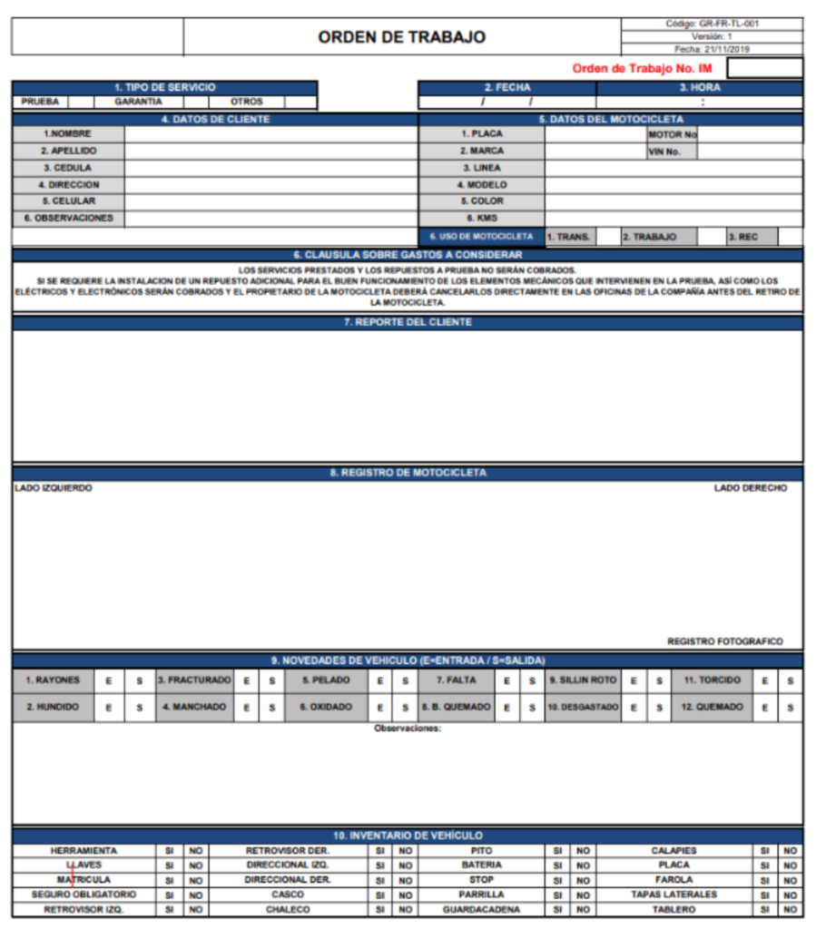 Una correcta gestión documental en el servicio técnico de motos asegura el cumplimiento de las normativas y regulaciones establecidas por las autoridades colombianas. La documentación de los procesos y procedimientos garantiza que el taller opera dentro de los límites legales y que los servicios se realizan de acuerdo con los estándares requeridos, evitando problemas legales y sanciones.