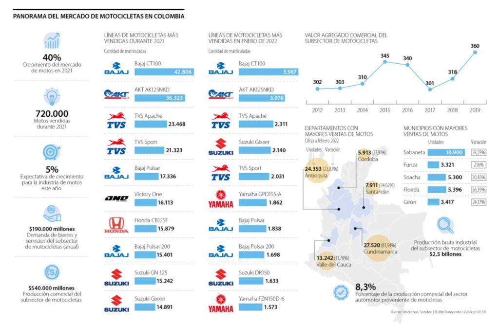 El mercado de motos en Colombia está influenciado por distintos perfiles de compradores. Los departamentos de Cundinamarca, Antioquia, Valle del Cauca y Bogotá concentran a los mayores compradores o dinamizadores del mercado. Además, algunos municipios como Funza, Sabaneta, Florida y Soacha, destacan por sus altas ventas de motocicletas.